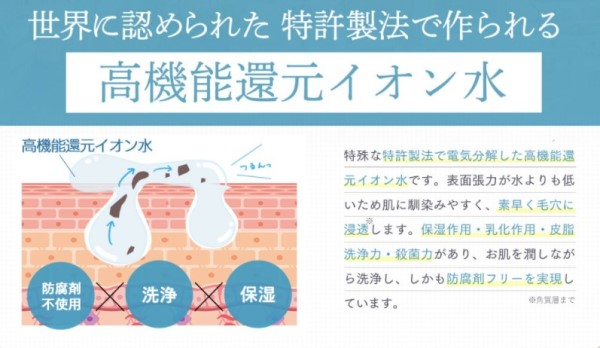高機能還元性イオン水は化粧水などにも使われるほど肌に優しいイオン水です。